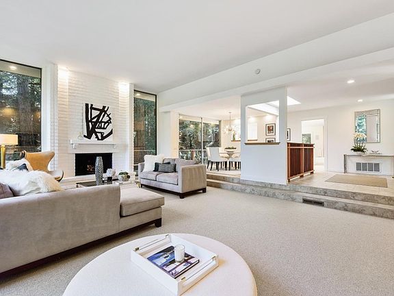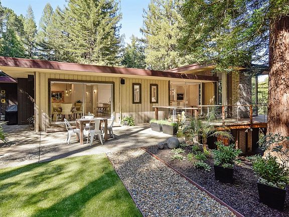 Mid-century modern masterpiece in magical setting w/5BD/3.5BTH — large floor to ceiling windows opening to the surrounding nature. Secluded back lawn, hot tub, in-ground trampoline. Grand scale living room, dining room, cook's kitchen w/adjacent eating area & family room. Terrific Master w/dressing area and office/2nd BD on main level; 3 BDS down + 2nd large family rm, laundry rm, storage. Close to trailhead for hiking, biking.