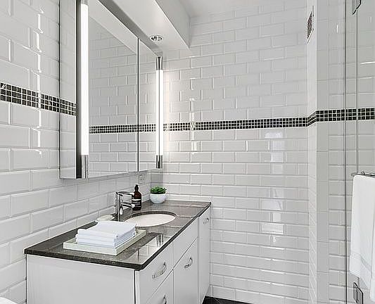 The second bedroom includes custom built-ins, window treatments and outfitted closet. The second bathroom consists of white subway tile and mosaic accent tile, bathtub, and pedestal sink. The third bedroom has custom built-ins, central A/C, wall of windows, and private entrance to the terrace. The third bathroom features a stall shower finished with glass mosaic tile and ¾ glass door, as well as floating vanity.