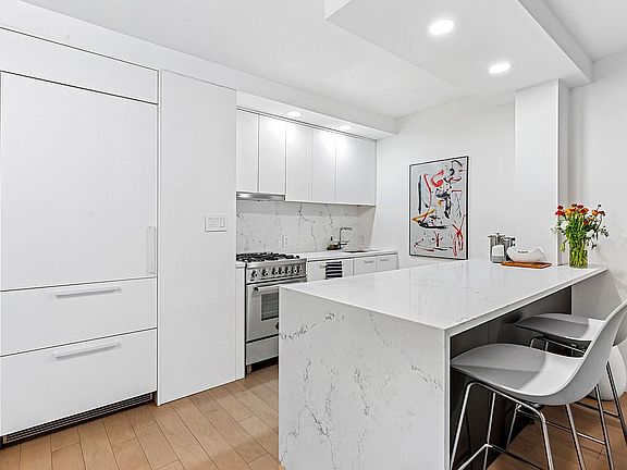 Perfect primary residence or pied-a-terre. Enter your new apartment into a welcoming foyer that leads to the dramatic open kitchen. The high end appliances include a built in Liebherr refrigerator, Bertazzoni range and Bosch dishwasher and microwave. The kitchen island is enormous with a quartz waterfall counter-perfect for entertaining. Beyond the kitchen, the living/dining area is 22 feet long and has ample room for a proper dining area and relaxing seating area. Best of all the living room faces South with high floor, open city views that provide sunlight all day long. The bedroom suite also faces South and has ample room for a king size bed, office area and storage space with two walk-in closets. The bathroom has been updated in style.