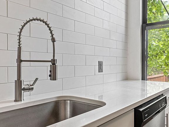 Modern Kitchen: Fully updated with sleek quartz countertops, a large stainless steel refrigerator/freezer, dishwasher, and plenty of cabinetry for storage.