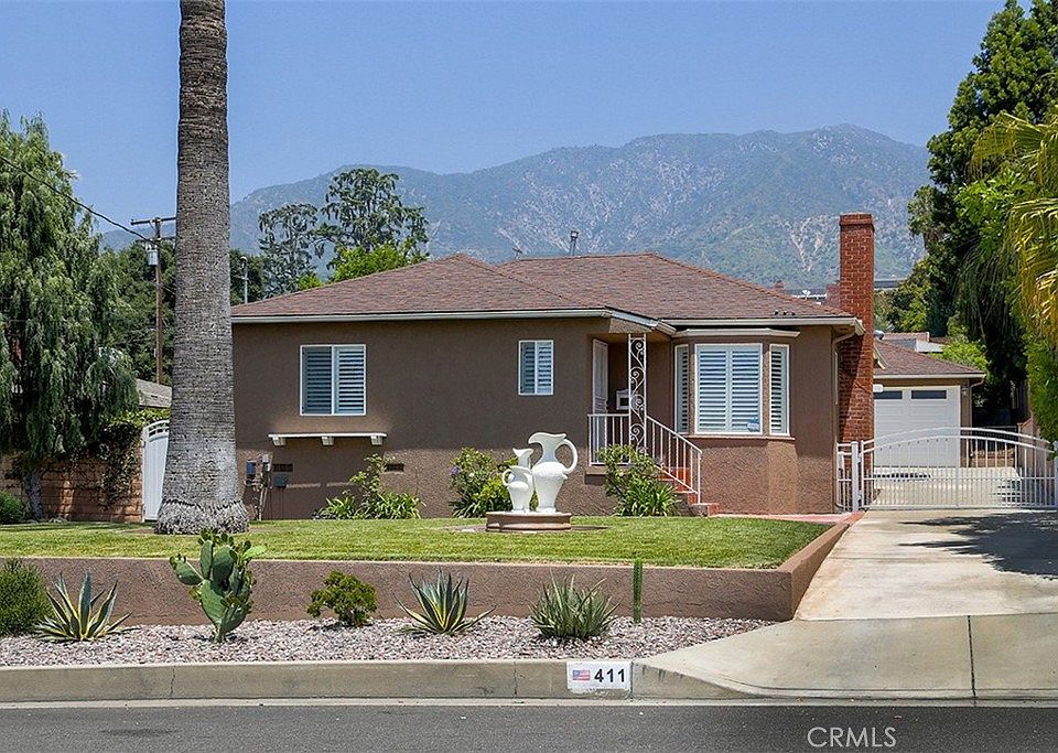 Welcome to the Foothills of Monrovia! This exceptionally charming single-level home, complete with a spacious and well-appointed ADU attached to the garage, exemplifies true pride of ownership. The main house boasts stunning hardwood flooring throughout the living room, hallway, and two main bedrooms. Elegant plantation shutters adorn every window, providing both style and privacy. Enjoy a premium audio experience with 5-piece BOSE surround sound systems in the living room and primary bedroom, while built-in speakers enhance the second bedroom and bathroom. The entire property features recessed lighting and has been freshly painted. A major upgrade in 2008 added a large master bathroom and walk-in closet, enhancing the living space with permitted improvements. The kitchen is a chef's delight, featuring a built-in Thermador stainless steel refrigerator, granite countertops, a large Wolf range/oven, and a GE Monogram range hood with heat lamps. Adjacent to the kitchen, the laundry room includes access to a sizable California basement, perfect for a potential wine cellar. A cozy den off the kitchen, equipped with a free-standing 3-person sauna, offers versatility as a dining room, exercise room, or even a third bedroom, complete with a closet/pantry space. Step outside to discover an entertainer's paradise. A patio cover spans the length of the house, providing shade for outdoor seating and sheltering a deluxe above-ground jacuzzi. The outdoor kitchen is fully equipped with a built-in BBQ, side burner, sink, and mini refrigerator. The detached ADU is over 600 sqft and features a small kitchen, ¾ bathroom, and a studio-style bedroom/living room area, making it ideal for aging parents, teen/adult children, or as a potential rental income source. The ADU also provides direct access to the garage, offering additional storage and parking for one car. Located in one of Monrovia's most desirable neighborhoods, this beautiful property combines the warmth of Southern California living with a stunning natural environment. Monrovia offers a unique blend of beauty, history, culture, and economic diversity. This home is more than just a place to live—it's a lifestyle. Don't miss the opportunity to make it yours!