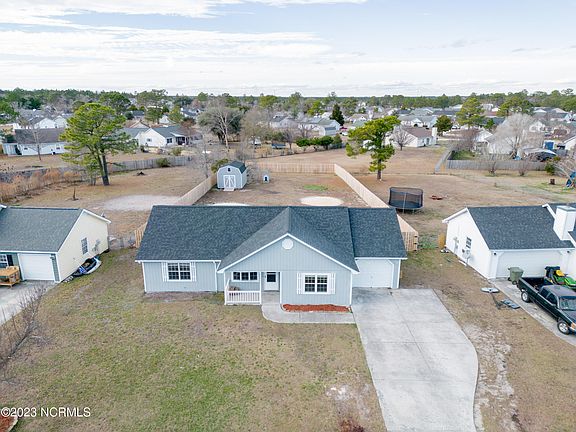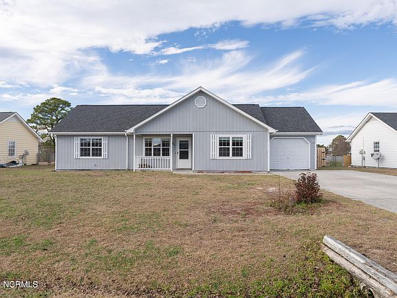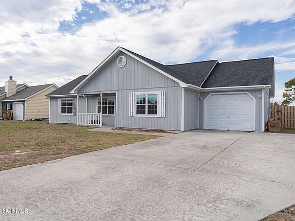 Nestled in the heart of Hubert and move-in ready, as you approach the front door, the covered front porch welcomes you. This charming 3-bedroom, 2-bathroom, and flex room/bonus room home are ready for its new owner. Roof installed 2019, Newer HVAC approximately 6 years old, updated stainless-steel kitchen appliances installed 2021, LVP floors in the main living areas and bathrooms, carpet in the bedrooms and flex/bonus. Open concept living room with natural lighting. Moving forward, you will find yourself in the spacious dining area and a kitchen with plenty of countertops and cabinet space. The split floor plan separates the owner's suite from the other 2 bedrooms. The laundry room comes complete with a mud sink. You will find an expansive cover patio in the huge backyard, and a very spacious, like new 12 x 16 shed was installed in 2021. The home is close to Camp Lejeune 172 gate, shopping, dining, and beaches. All this and NO CITY TAXES, this home waits for you! Call and schedule your showing today!