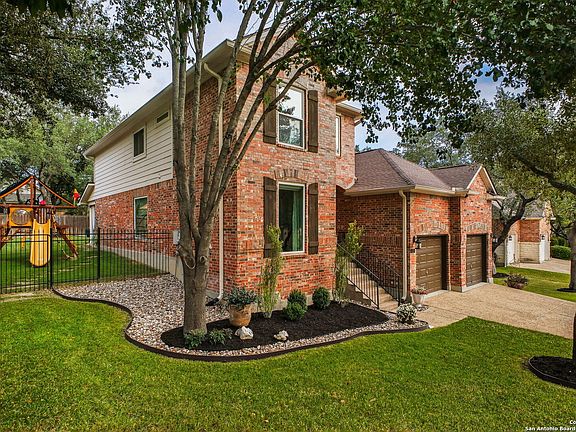 Located on a quiet street in the guard-gated Heights at Stone Oak, this 4 bed/3.5 bath 3,260 SF Newmark home blends classic design with thoughtful updates. Brick-and-stone exterior and mature oaks create timeless curb appeal. Main level features hardwood and tile floors, a private study with French doors, and an open kitchen with granite counters, recessed lighting, island, & double ovens. Living room centers around a white-stone fireplace with views of the shaded .23-acre yard and covered patio. Primary suite down includes crown molding, Spa like bath with French-door access, dual vanities, jetted tub, and large walk-in closet. Upstairs offers a spacious game room + 3bed/2baths. Updates include new roof, windows, HVACs, fence, shutters, water heaters, water softener, interior & exterior lighting. Community pool, parks, and sports courts nearby; minutes to HEB, Whole Foods, Canyon Springs Golf, and top NEISD schools zoned to Reagan High.