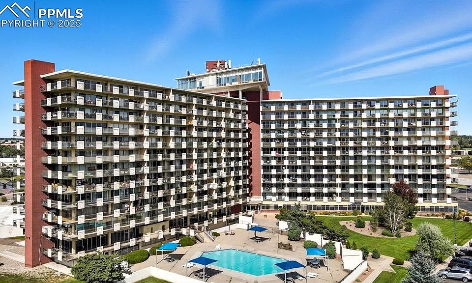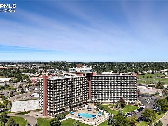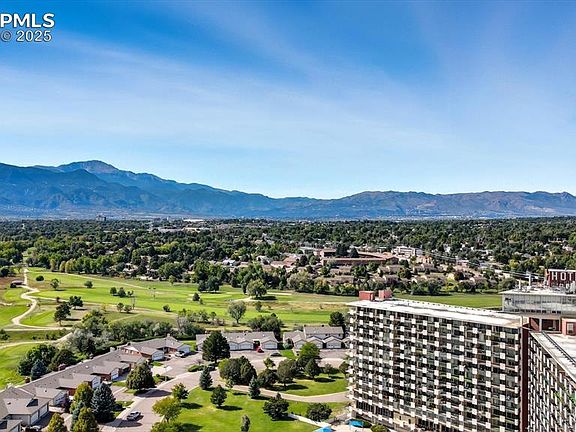 Enjoy a fabulous opportunity to own a truly distinctive 1-bedroom, 1-bathroom condo in one of the area's most iconic buildings. Nestled in the historic Satellite Hotel, this unit offers endless potential and panoramic views that will leave you speechless. Step onto the expansive covered balcony and take in unobstructed vistas of snowcapped Pikes Peak, the majestic Front Range, golf course, and sparkling city lights at sunset. Whether you're enjoying your morning coffee or entertaining guests in the evening, this outdoor space is a showstopper. Inside, the condo features a light-filled, open floor plan perfect for relaxing or hosting. The spacious living room flows seamlessly to the balcony, while the kitchen includes a smooth-top range, vent hood, and refrigerator. The generously sized bedroom boasts a walk-in closet and private access to the balcony, and the full bathroom offers a tiled tub/shower combo and vanity. This unit is a blank canvas, ready for your personal touch. With central air and hot water heat, year-round comfort is guaranteed. Private locked cabinets on the balcony provide extra storage, and the building’s incredible amenities elevate everyday living: enjoy access to a pool, sauna, gym, billiard room, library, tennis courts, bar, restaurant, spa, laundry facilities, and security. All utilities (electricity, heat, and water) are included in the monthly HOA dues. Located near the Valley Hi Golf Course, this condo is just minutes from local shopping, dining, entertainment, and major landmarks like downtown Colorado Springs, Garden of the Gods, Palmer Park, & the US Olympic Training Center. It also offers easy access to military installations, making it an ideal choice for those seeking convenience and scenic living. This delightful condominium offers the perfect mix of charm, potential, and unbeatable views. Bring your vision and transform this diamond in the rough into your dream home.