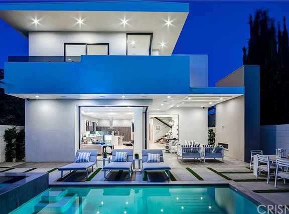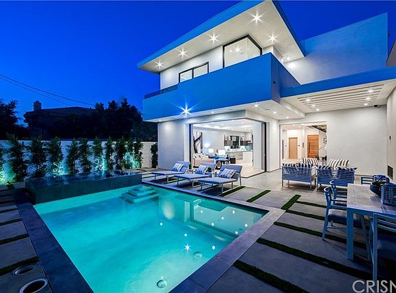 Newly Constructed, Gorgeous modern with architectural lines, French oak wide plank floors, high ceilings, and luxurious finishes. A wide entry hall with winding glass-walled staircase sits next to an elegant formal dining room with floor-to-ceiling windows. Gourmet Chefs kitchen with dual wall ovens and Center Island with range, suspended hood, and breakfast bar. An inviting living room boasts a modern fireplace and a wall of pocket doors, perfect for entertaining. The romantic master suite has a large fireplace, private balcony, incredible closet, and spa-like bath with soaking tub and massive glass rain shower. Spacious guest bedrooms boast private balconies and beautiful baths, offering wonderful accommodations for family and friends. Outside, the incredible entertainers yard features a sparkling pool, elevated Zero-edge spa, and open patio. A truly marvelous home for the most discerning host. Located just south of Melrose, close to shops, fine dining, and more. Architectural design by Eran Gispan of NE Designs.