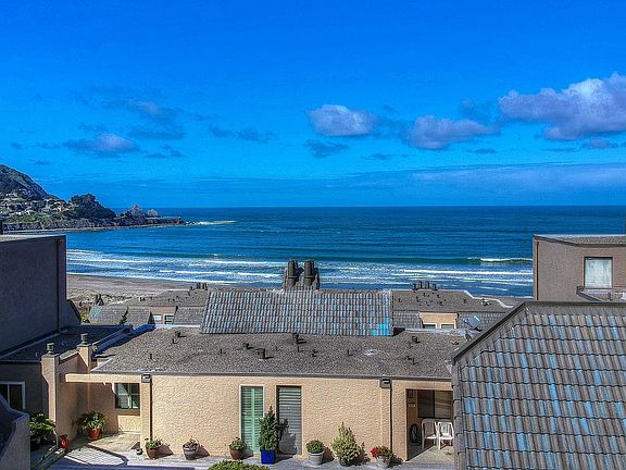 Not only does this condo have Ocean Views from almost every room, it is across the street from the beach. This condo has one of the best views in the complex. Beautiful views of Pedro Point and Linda Mar Beach. Remodeled Kitchen and Bathrooms. Beautiful newer dark laminate floors. Plantation shutters. Upstairs has a beautiful kitchen, a half bath, a separate dining room and living room. Living room has a gas fireplace and a beautiful wet bar. Downstairs has a 2 master suites and a laundry room. Larger bedroom has a second fireplace. Decks on both floors. This unit also is one of the few units with an attached garage on the third story down. The garage is over-sized and accommodates two cars plus lots of storage. 1480 Square Feet.