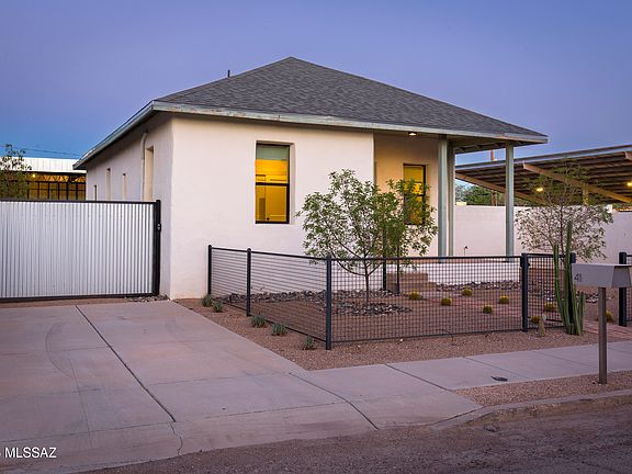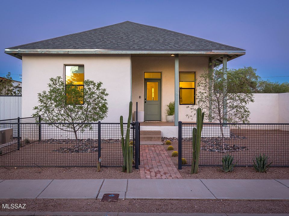 Located in Tucson's creative and eclectic Lost Barrio, this c.1912 mud adobe bungalow seamlessly blends historic charm with modern livability. Thoughtfully restored and modernized in 2022 the home captures the warmth and energy efficiency of traditional adobe construction while integrating modern design, finishes, and systems throughout.Thick adobe walls provide natural thermal mass, complemented by dual-pane windows and xeriscaped front and rear yards, offering year-round comfort and low maintenance. High ceilings, generous windows, and both front and rear sitting porches create a sense of openness and connection to the desert light. The interiors feature a harmonious mix of wood and ceramic tile flooring, while the spacious kitchen showcases quartz counters, a large island, and stainless steel appliancesperfect for cooking and gathering.