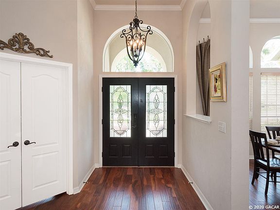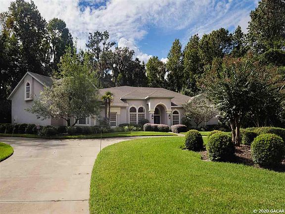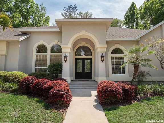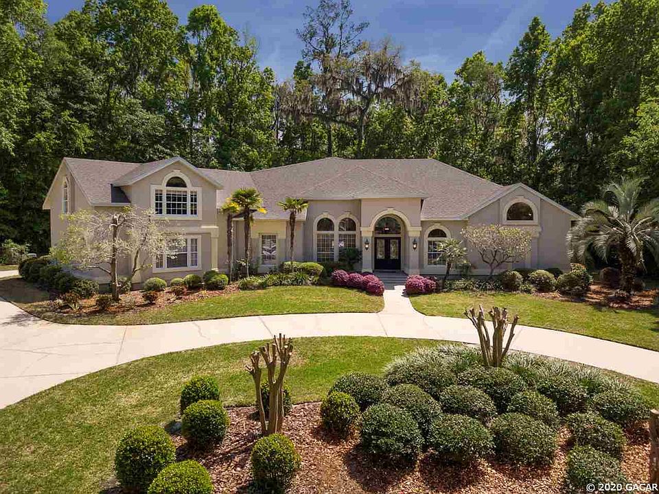 Stunning pool home on 1 acre in the appealing gated Hampton Ridge neighborhood. Impressive and spacious ~ 4Bedrooms "PLUS" an office & 3.5 Bathrooms, stylish & casual dining, a large open & bright family room with windows galore and a desirable 3-way split floor plan. The kitchen has been thoughtfully designed & implemented with the expectations and desires of the most discerning Chef de Cuisine in mind ~ gas cooktop, convection double ovens, built in spice and storage drawers and pantry, large prep island, quartz counters, quality stainless appliances, luxury cabinetry with lighting and many upgraded features throughout. Wood flooring, 12ft ceilings in main areas, tankless water heater, fireplace & well appointed. Owner's suite, family, kitchen and living rooms all have amazing views of the picturesque pool and surrounds. Tucked away on a cul de sac, the nicely landscaped yard is enhanced with custom lighting and elegant iron fencing to further impart the ambiance of a private resort setting. Architectural roof 2018 and attention to every detail is the theme of this beautiful home. Great location, fantastic schools and convenient to shopping, parks and recreation! Gainesville at it's finest!
