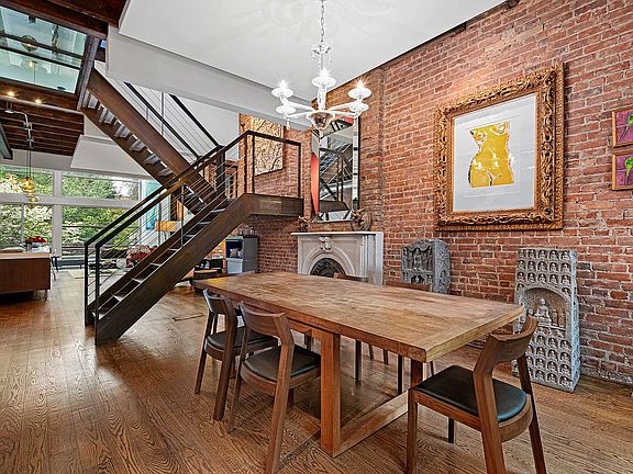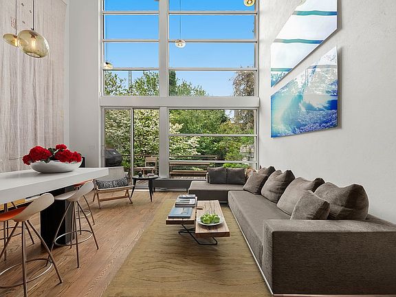 A dream home for the discerning buyer, the triplex reflects the vision of a well-connected open space that is comfortable and contemporary. The parlor level affords an ideal setting for entertaining, with an effortless flow from the generous dining room to the expansive two-story living room and top-of-the-line chef’s kitchen. Sliding glass doors provide entry to the large outdoor balcony for coffee, cocktails, and outdoor pleasure. Steps descend to the glorious fenced-in rear garden, the ultimate alfresco experience with lots of trees and room for lounging, dining, and planting. Heightening the allure is a chic guest powder room accented by a green shag rug wall and marble sink resembling teak wood, and an 8 ft-wide lipstick-red panel soaring 40 ft. to the skylight.