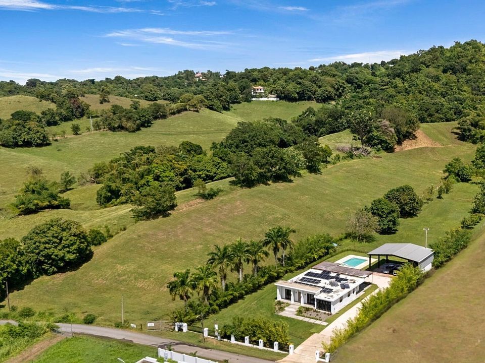 Nestled in the peaceful mountains of Rincón, Desecheo Surf Ranch is a modern home set on nearly two acres of lush tropical land, designed to offer a tranquil retreat that seamlessly blends modern comfort with the natural beauty of the island. The home features 3 bedrooms and 3 bathrooms, each with sleek modern finishes and an atmosphere of refined simplicity. The open-concept kitchen includes a spacious island and modern appliances, perfect for both everyday living and entertaining. A grand entrance with a piano welcomes you in, setting the tone for the property's distinctive character and contemporary elegance. Outdoors, the property offers a true private oasis - a saltwater, heated swimming pool and spa, surrounded by a spacious 1,000 sq. ft. back patio and beautifully designed landscaping with low-voltage color-changing outdoor lighting that illuminates the property at night. You'll also find mature avocado, tamarind, breadfruit, and mango trees, adding a lush tropical touch to the surroundings. The home spans approximately 2,500 sq. ft., combining generous living space with an effortless indoor-outdoor flow. Additional features include solar panels for energy efficiency, a gated entrance for privacy, and ample room to expand - whether you envision a guest house, garden, or outdoor recreation area. Desecheo Surf Ranch is more than a home - it's a modern sanctuary where luxury living meets peaceful island life, offering the perfect blend of style, comfort, and connection to nature.
