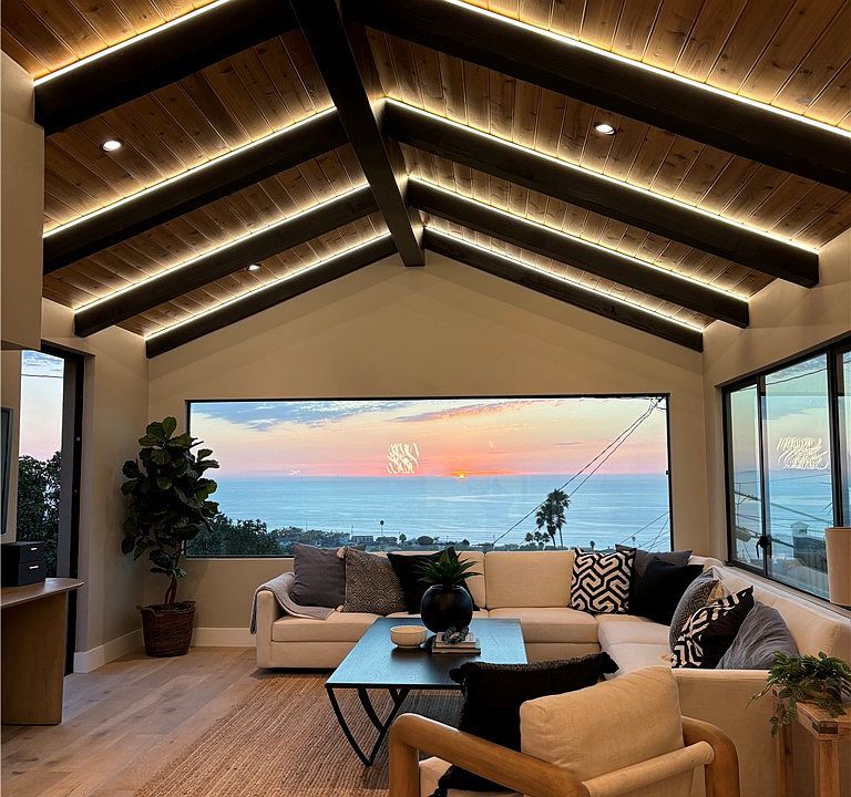 The rear living room is the architectural highlight, featuring vaulted ceilings with exposed wood beams and custom integrated LED lighting that accentuates the dramatic wood-plank detail overhead. A seamless flow leads into the dining area and designer kitchen, where quartz counters, premium stainless steel appliances, custom cabinetry, and an oversized island create a stylish and functional space for both entertaining and everyday living.