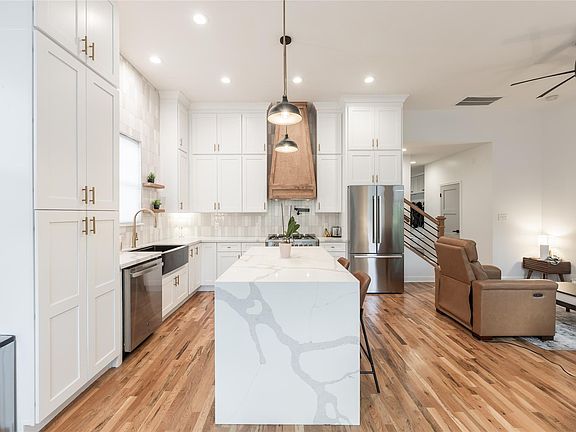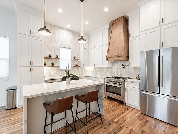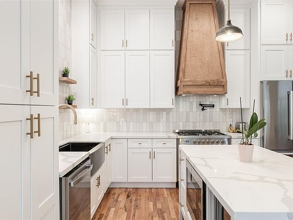 Turnkey home with wood floors, high ceilings, open-concept layout, and abundant natural light. The kitchen boasts custom features like a pot filler, farmhouse single-basin sink, and vertical subway tile backsplash that complements the quartz waterfall island, six-burner gas range, and wine fridge for a touch of sophistication. Two downstairs bedrooms share a stylishly renovated full bathroom with a new vanity and quartz countertop, plus a convenient half bath and built-out mudroom with ample storage. Upstairs, the spacious primary bedroom showcases tray ceilings, a walk-in closet, and a barn door leading to the luxurious bath with dual vanities, quartz countertops, a soaking tub, and a standalone shower with bench and dual showerheads. Enjoy the balcony overlooking a large backyard with storage shed. Conveniently located with new roof, HVAC, plumbing, electrical, and water heater.