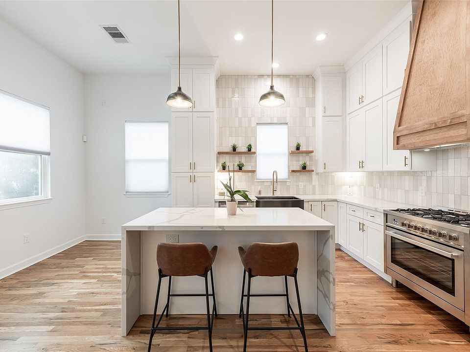 High ceilingsWood floorsAbundant natural lightNew vanityQuartz countertopQuartz waterfall islandFarmhouse single-basin sink