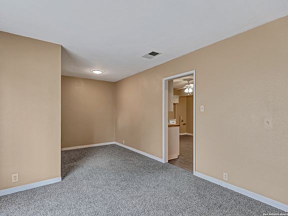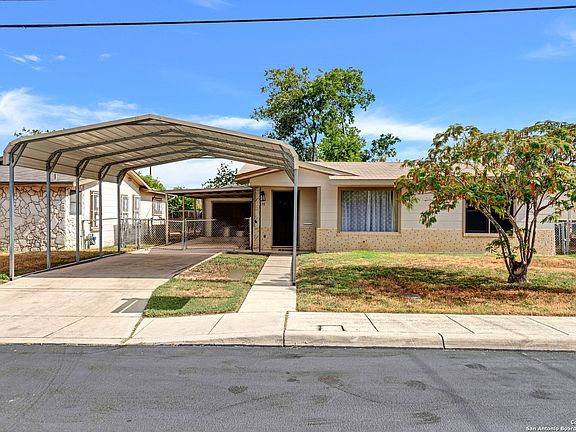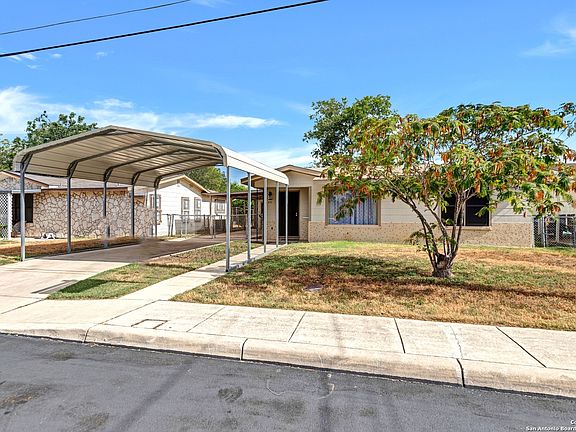 Conveniently located near IH-35, Hwy 90, downtown, Texas A&M, and Palo Alto College, this charming single-story home is ready for new owners. It features new ceiling fans in all bedrooms and the kitchen, along with updated light fixtures in the living, bathroom, and kitchen. Fresh paint has been applied both inside and out, enhancing the home's appeal. Interior highlights include new carpet in two bedrooms and the living room. The kitchen boasts tile countertops and back splash, new stove, and cabinets with new hinges and knobs. The bathroom features tile flooring and a bath/shower with tile. Solar screens on all windows provide energy efficiency. Outside, the property offers a detached garage with an AC window unit, an attached carport, and an additional metal carport at the front of the driveway. This home is a must-see for those seeking convenience and modern comfort!