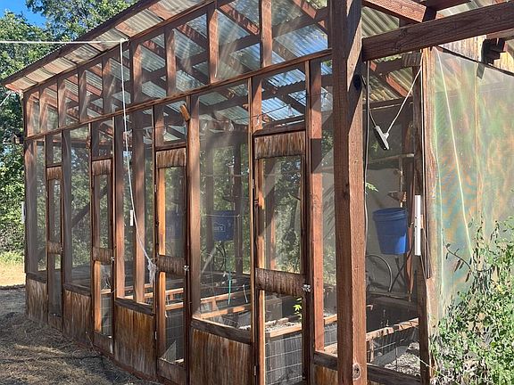 Rare opportunity to own 5 plus acres with county water at the 3100 foot elevation for a sunny mix of pines, cedar, and oak adjacent to other large parcels for peaceful privacy but only a 7 minute drive to Murphys. Plenty of useable space for animals, gardens and another building site below the existing home. Well built cottage has 3 garage spaces and shop area. Above the garage the floor plan is a great room with ridgetop views, 2 bedrooms, bathroom with jetted tub, and a pull down ladder to finished loft. Air conditioning and heat are efficient split units. Outside amenities include large storage shed, garden shed and screened in green house. There is a large fenced area adjacent to house perfect for dog run.