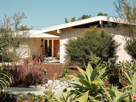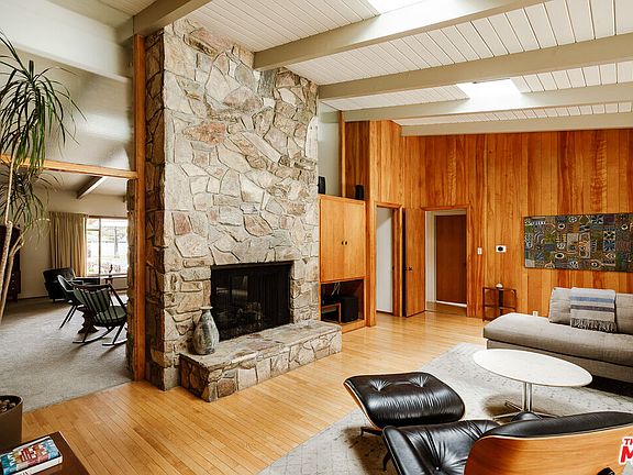 The Fox Residence, Paul L. Williamson (1957). An extraordinarily well preserved mid-century modern post and beam home situated on a more than 11,000 square foot lot in Long Beach's Los Cerritos neighborhood. Offered for only the second time since built, its current owners have taken great care to respect the home's originality wherever updates have been made. At the street facing, a bright white rock roof and trellised entryway with red door give clues of what lies beyond. Inside, a large double sided stone fireplace lands at the apex of a beamed ceiling, providing delineation for what is an otherwise vast open plan. Obscure glass panels on each side allow light to pass between these rooms throughout the day. Honey colored Birch paneling and built-ins enrich a skylit living space, which features a wall of glass and sliding doors that face out to the expansive rear yard and pool. The roofline extends to shelter a raised patio that provides for areas of shaded dining and lounging. An island counter with wet bar and wine fridge separates the living area from the kitchen and its adjacent dining area. A sensitive remodel of the kitchen retained original cabinetry with reeded glass doors and brought in Heath tile, quartz countertops, and Bosch & Jenn-Air appliances. The spacious open plan family room/dining area features beamed ceilings and built-in display cabinets. With the adjacent 3/4 bath and hallway wardrobe closet, this more formal dining room would function well as a 4th bedroom with just the addition of one interior wall. A hallway with additional storage buffers the north bedroom wing from the rest of the home. The primary bedroom features a dramatic southest facing corner window detail that frames a view overlooking the pool and yard. The more than quarter acre lot appears even larger than its measure- with a sprawling lawn, pool, patio, and pool house all well placed on the property. Privacy hedging and the canopy of a majestic Pepper Tree make for a parklike setting. The detached pool house/studio measures approximately 200sf, and has not been included in advertised size of home. Located amongst the estate properties of the Los Cerritos/Virginia Country Club area- with its tree lined streets, historic homes, excellent school district, and an incredibly quiet, peaceful atmosphere.