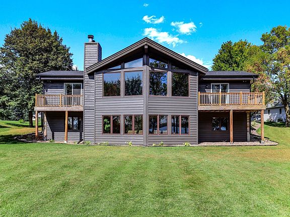Year round serene retreat on Wells Lake with 110 feet of level shoreline offering panoramic lake views. Location is everything and this one offers almost 1 acre of a country setting but within minutes to shopping, dining and access to I-35. Top to bottom, this wonderful one story has been thoughtfully updated with modern finishes...you can move right in and leave the projects behind while you enjoy time relaxing, entertaining and endless fishing! Stunning wood vaulted ceiling with wall to wall windows offers stunning lake views. Wood burning fireplaces up and down plus a custom entertainment center with fireplace in primary bedroom. Kitchen remodel includes all new stainless steel appliances, quartz countertops, custom cabinets and an 8 person island for gathering. Highlights include new LVP flooring/carpet throughout, remodeled lower bathroom, skylights, an open staircase, new main level ½ bath, new fixtures, newer water heater & softener, freshly painted inside and out, new trim throughout, walkout lower level and more! Wonderful primary suite offers a private deck, walk in closet, walk in shower & dual vanity. 2nd bedroom has sliding doors to deck providing easy access to the outdoors. The perfect size home with almost 3000sf along with a 3 car garage on a beautiful tree lined lot. Roof & septic only 2 years old. Wells lake joins with Cannon Lake offering over 2000 acres of water to explore. Your dream lakefront home is waiting! Call today!
