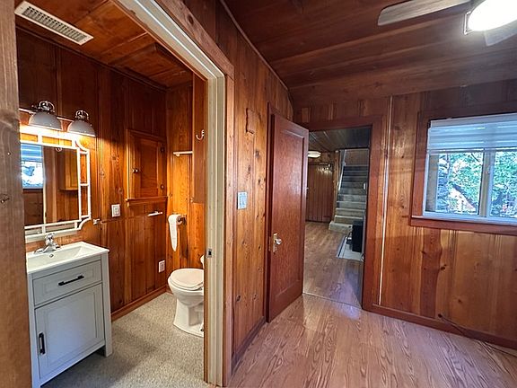 Clean and Pretty, this 3 bedroom 2 bath home, has fresh paint, new carpet and is clean and beautiful! The main level Hosts big living room with efficient wood burning stove inserted into native river rock fireplace, adjacent to kitchen, laundry full bath and main level bedroom. Upstairs consist of 2 bedrooms, I of which is master with walk in closet and en suite full bath. Detached single car garage has second fridge and tons of storage, not really meant for a vehicle. Back yard quiet and dreamy!