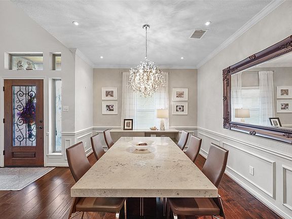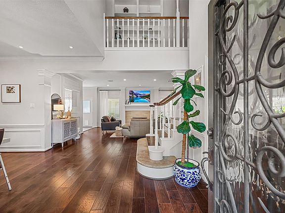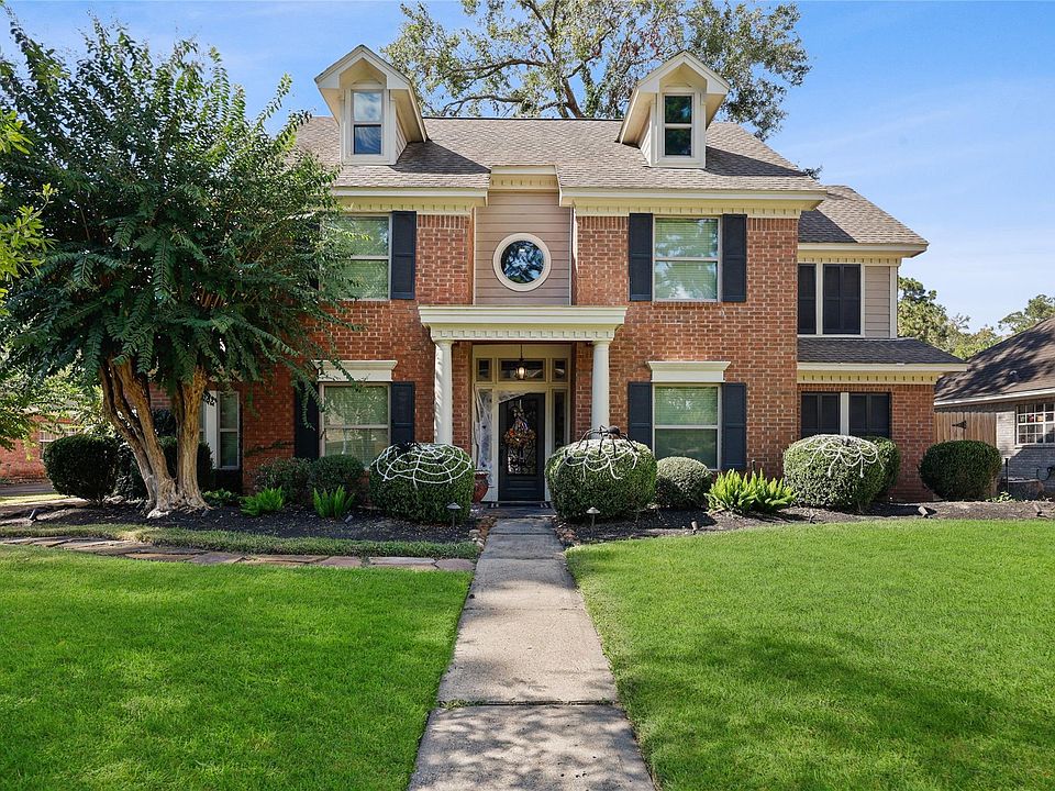 Elegant two-story home in Greentree Village featuring soaring ceilings, formal living and dining rooms, and a cozy fireplace. A beautifully paneled library provides a quiet retreat, while the skylighted kitchen and breakfast area are filled with natural light. The spacious primary suite is conveniently located on the main floor, with a game room and three bedrooms upstairs. Recent updates include a New Roof, Electrical Improvements, and Tree Removal.