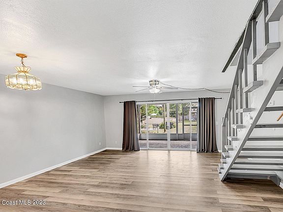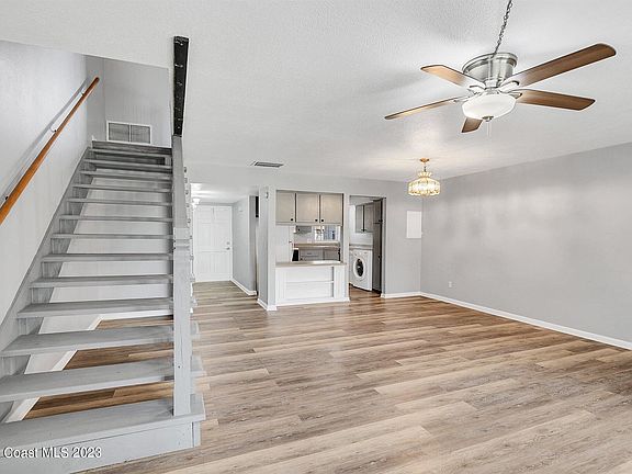 Two story townhouse style unit located in Titusville. Unit offers 2 bedrooms, 1.5 bathrooms. Wood laminate and tile flooring throughout. Living/Dining room combo. Kitchen with pass through counter. Washer and dryerin kitchen. Screened front porch and rear screened porch. Primary bedroom features a screened balcony and en-suite bathroom with double sink vanity and tub/shower combo. Pet friendly - 1 small pet with owner approval and non-refundable $250 pet fee; no aggressive breeds. Home square footage, and lot sizes should be independently verified. After approval a $100 Admin Fee will apply fee and lease must begin within 14 days. Home is rented in AS-IS condition, If present, washer and dryer are convenience appliances and will not be warrantied/ repaired by owner.