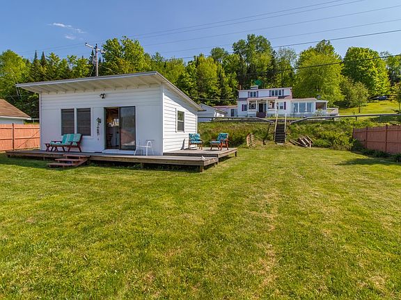Wallace Pond, known as Lac Wallace on the Canadian side, is a sparkling 532-acre international lake ready to be the setting of your new year-round residence or home away from home. With 75’ of water frontage, the seasonal cottage offers a kitchenette, dining and living room space, as well as a ¾ bath inside; outside there’s a wrap-around deck and level lawn area so you have everything you need for long, hot summer days at the lake. Across the road, the main house is perched on 2.36 acres, where you’ll be comfortable taking in the wonderful northerly views of the lake and surrounding mountains thanks to the deck, covered front porch, enclosed porch, and window-wrapped sunroom. A remarkable stone chimney is a unique feature in the kitchen, while the outdoor sights are the main draw in the dining room. Pine walls and a brick wood-burning fireplace make the living room warm and inviting. A bedroom, office, laundry area, and full bath complete this level. Up the stairs, 2 bedrooms share another full bath. Boating, fishing, and swimming are literally outside your door, and hiking, ATV, and snowmobile trails are also nearby. Make an offer now and make the most of summer and all of Vermont’s other seasons with this special two-for-one lakefront property in the spectacular Northeast Kingdom.