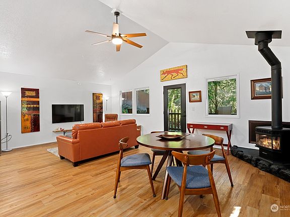 Just steps from Deer Lake this recently renovated rambler offers privacy & tranquility. The spacious interior features vaulted ceilings & an open floor plan. The home boasts a full refresh w/laminate HW floors, striking black & white tile, a tiled shower, updated bathroom vanities, marble countertops, a tiled kitchen backsplash, modern lighting fixtures, fans, & newer appliances. Primary bedroom with updated en-suite bath, 2nd bedroom and guest bath. At Deer Lake enjoy a covered picnic area, BBQ, swimming, & a dock for jumping into the water. Home is set back from the street with lots of privacy and a level fully fenced back yard! Recent upgrades include a 50-year roof (2018), a new water line, and an improved deck (2020).