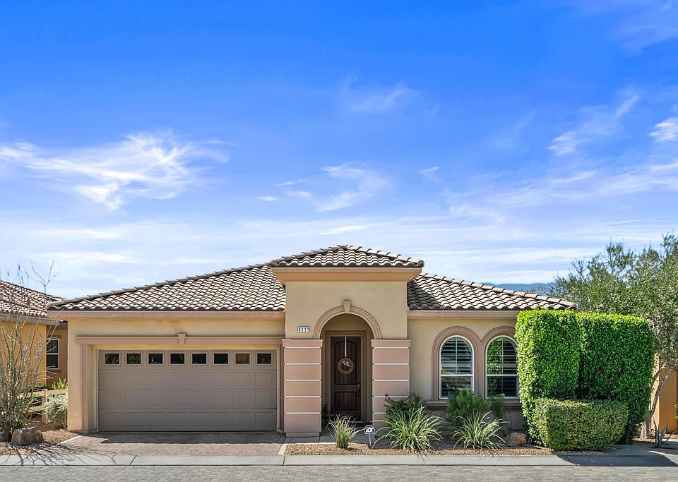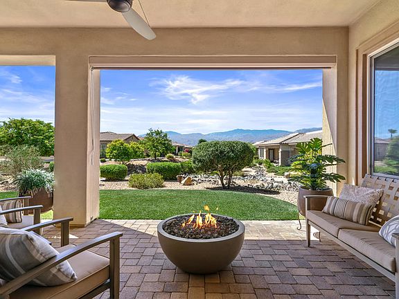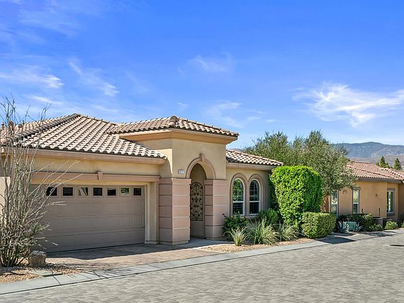 Introducing Villa Portofino, the ultimate destination for those seeking an exceptional 55 or better community experience in the heart of Palm Desert. Prepare to be captivated by 4111 Via Tramonti, a residence that is being which boasts the most coveted view lot in Villa Portofino. With no homes obstructing your sight, you'll be treated to breathtaking mountain vistas that will leave you in awe. Prepare to be impressed by the abundance of upgrades, from the recently painted interior, brand new water filtration system, just installed upgraded tankless hot water system, exquisite lighting fixtures, porcelain flooring, custom built-ins throughout which were completed in 2024, custom master closet organizer and added bar area w/refrigerator. Even the garage has been transformed into a haven of luxury, featuring epoxy floors, air conditioning, and added insulation - a testament to the commitment to excellence that defines this property. Indulge in the luxury of two spacious patios, with the rear patio stretching an impressive thirty feet. Three brand new electric shades being installed on back patio this week at a cost of 14k for your privacy and shade in the summer. Embrace sustainable living with the added benefit of leased solar panels for a mere 73 dollars per month. You will love the 30,000 square foot clubhouse with state-of-the-art movie theater, billiards room, serene meditation room and invigorating yoga studio, fitness center, Bistro, Pool and more!