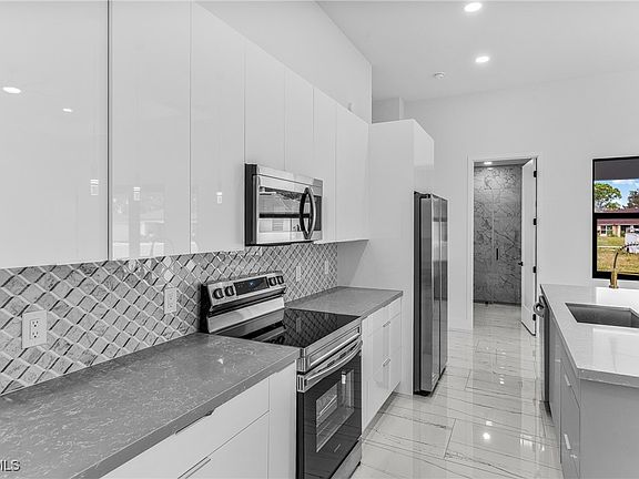 Introducing a stunning example of contemporary luxury living: this beautiful new construction boasts a modern aesthetic that is both chic and functional. Step into the spacious kitchen, featuring a sleek island with high-end stainless-steel appliances and quartz countertops, perfect for cooking and entertaining. European-style acrylic cabinets provide ample storage, complementing the clean, minimalist look. Throughout the home, porcelain tile flooring adds elegance and durability. In the bathrooms, LED light mirrors combine style with practicality for a truly indulgent experience. With four bedrooms and two and a half bathrooms, including a master suite with his and her sinks and an elegant tub, comfort and luxury abound. From the floating modern vanities to the acrylic European style closet doors, every detail has been carefully curated for modern living at its finest. And with an extended lanai and sleek finishes, calling this paradise is an understatement.
