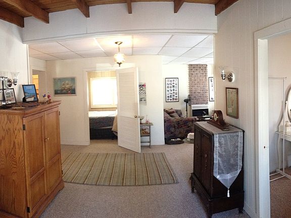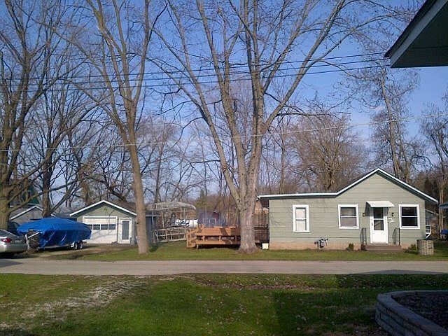 Very clean & in great condition this cottage has had 2 owners since built in 1948. Updated recently with brand new bathroom, light painted walls, outside just painted with polymer brick siding around bottom third of home. It has a grandfathered pier rights that goes along with an 80 foot pier at the end of street approx. 60 yards walk from your front door at most. Nice street with nice neighbors, mostly summer or weekenders. Large lot size 100x90. has a 1 & 1/2 car garage with large driveway which can fit at least 6 cars. Garage stores boat & other stuff (boat does not come with house). Inside is bright & has a very large kitchen/family room open concept which was an addition & is all windows to give nice views from 3 sides. You have lake view from front of home & look directly down the street at your pier. New circuit breaker panel just installed with extra outlets just this past season. New kitchen sink & counter top was redone. Has ample cabinets in good condition. Family room is 19x19, Kitchen is 10x13. Then there is a living room/great room which is 17x13. There are built in storage closets & curio cabinet. Master bedroom 11x7, bed 2 is 9x8 & bed 3 is 9x11. The front part of the home & all the bedrooms have beautiful pine ceilings. there is a natural gas space heater in wall that warms well on chilly nights. window a/c units in back part of house & in 2 bedrooms. There are overhead fans in 2 bedrooms & also 2 overhead fans in family room in back part of home. new beige high quality Berber carpet throughout with laminate wood look flooring in kitchen & bathroom has vinyl grey multicolor which cleans really nice. Has white large refrigerator & white gas stove. Has very large 10 seated deck just stained last season & looks nice. Has fire pit in yard for campfires.