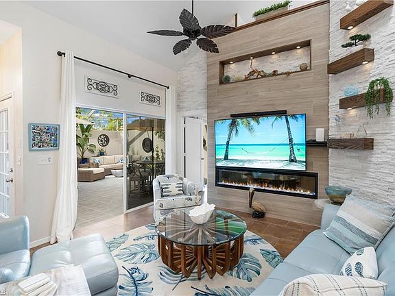 Discover this light-filled, airy retreat located in one of the most desirable areas of town—just minutes from I-75 and only 4 miles from the beach. This stunning home features cathedral ceilings and dramatic trapezoid windows in the primary bedroom, inviting in abundant natural light. Three sliding glass doors create seamless indoor–outdoor living, including private access from both the primary and guest bedrooms, plus an additional slider off the living room. The living area showcases a gorgeous stacked-stone and tile accent wall with an electric fireplace and custom lighting, creating a warm and inviting ambiance. Enjoy not one, but two expansive courtyards: an elevated sun deck off the upstairs loft nestled among the treetops, and a beautifully updated lower courtyard complete with new tile pavers with a stylish accent design. The custom garage, just adjacent to the courtyard boasts cabinetry, a sink, countertops, and ceiling storage. The well-appointed kitchen features sleek stainless steel appliances and granite countertops with elegant movement that will captivate the most discerning buyers. Both bathrooms have been tastefully updated with modern glass shower doors. This vibrant community offers resort-style amenities including a sparkling pool, tennis courts, and scenic bike and jogging paths. Experience the perfect blend of comfort, style, and location—your coastal oasis awaits.