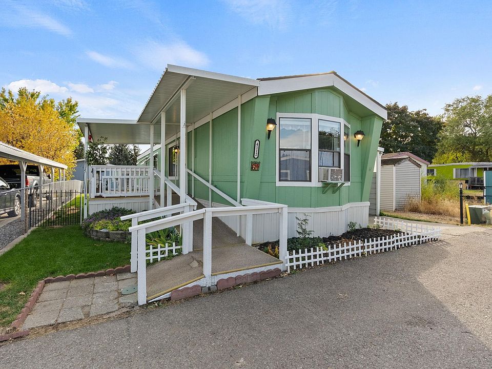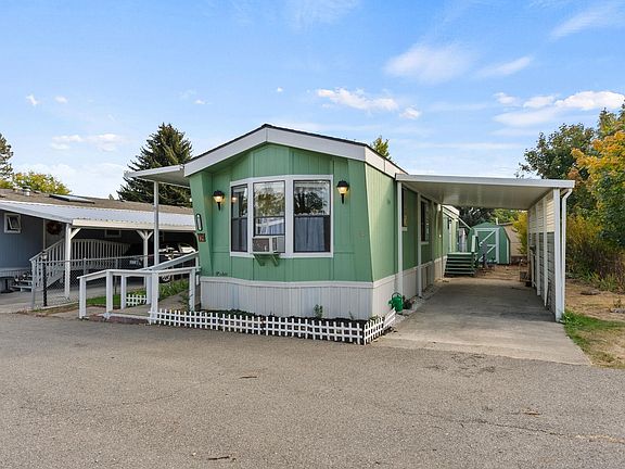 Welcome to Mountain View Mobile Home Park in Mead. The exterior of this home has been freshly painted. This home has a great layout with a spacious and a double vanity. Covered deck with new stairs to the fenced yard, and storage shed. Carport. Lot rent is $450/mo and covers water, shared septic, snow removal, & common space lawn care. Park allows up to 2 pets. Mead schools. Close to the North-South Freeway.
