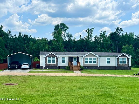 Custom 4 BR 2 BA Manufactured Home situated on 4 acres located at 4112 Tyson Rd, Wesson, MS. Walk inside into a foyer area that opens into the living room onto the kitchen and den! This home features a luxurious kitchen with a large island and nice appliances including a flat surface range, oven, microwave, dishwasher, and refrigerator! Also, there is lots of cabinet/counter space, a pot filler, and a pantry! This split plan has a huge master suite with a soaking tub, separate shower, double vanity, and a walk in closet with built ins. Moving on back through the den you will find the other 3 bedrooms and bathroom with a double vanity and tub/shower combo. There is a nice fireplace that remains with the home! The new custom floors throughout are Beautiful!! Lots of extras including the screened back porch, front porch, rain gutters, fenced back yard, double carport, circle drive, and Storage building with electricity and AC!!