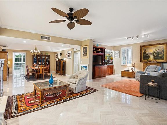 Elegant details abound with marble flooring, granite countertops, custom built-ins, and a spacious island kitchen with newer stainless-steel appliances. The oversized primary suite includes a huge custom closet and updated spa-style bath.