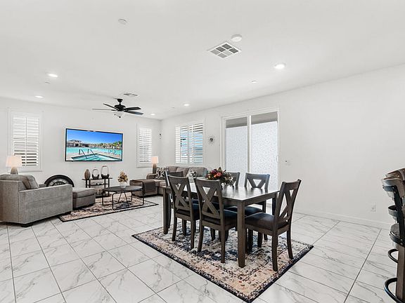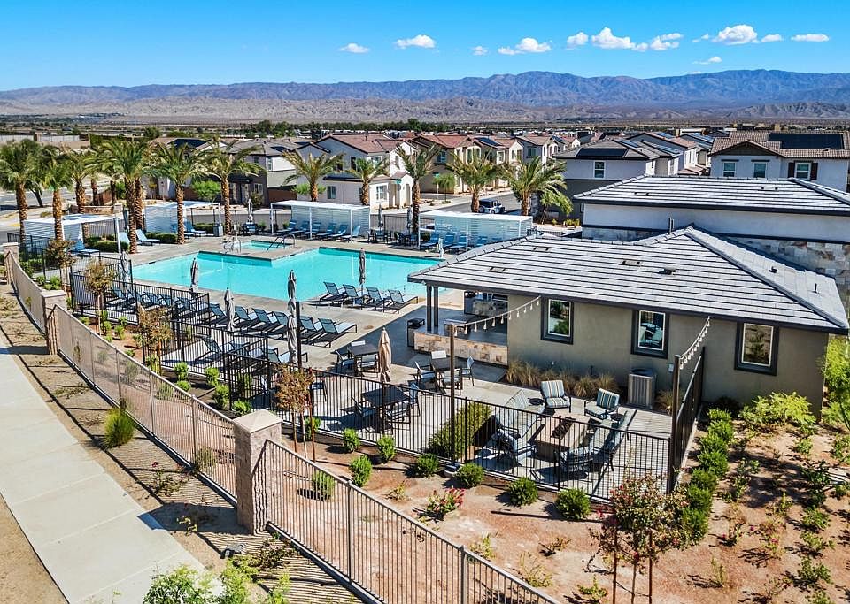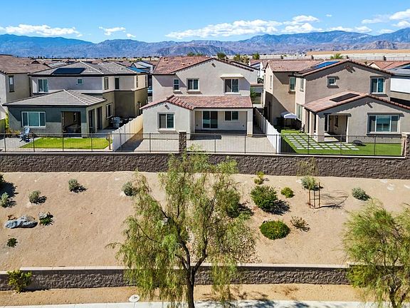 Discover modern elegance at this stunning Lennar-built 2-story residence in the desirable University Park master-planned community, completed in 2022. Offering 2,032 SF of thoughtfully designed living space & chocolate mountain views, it features 4 bedrooms and 3 full baths-including a convenient guestroom on the main level & 3 spacious bedrooms upstairs. Step inside to a harmonious open-floor layout where the Great Room, dining area & chef's kitchen beautifully flow together. Abundant natural light & seamless indoor-outdoor access create a perfect setting for entertaining & relaxing. The kitchen boasts gray cabinetry paired with Miami Vena quartz counters, complemented by a large walk-in pantry & modern appliances including a double oven & tankless on-demand water heater. Retreat upstairs to the luxurious owner's suite, complete with a spa-inspired bathroom & generous walk-in closet, offering comfort & sophistication. Additional highlights include recessed lighting & smart-home features powered by owned solar panels. Outside, enjoy covered patio living with mountain views & an opportunity to create your own private backyard haven. Community amenities include a recreation facility with kitchen, BBQ's & outdoor dining, plus pool & spa with large fire pit area & lounging cabanas throughout-all set amidst desert palms, landscaped surroundings & close to premier golf & upscale shopping & eateries.