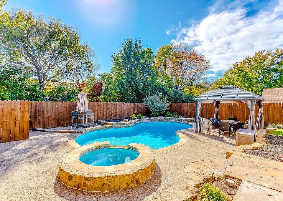 Beautifully renovated 3-bedroom, 2-bathroom home with pool located in the established Meadowcreek Park neighborhood in Garland. The open layout connects the living, dining, and kitchen areas, creating a practical and welcoming space. Spacious kitchen features stainless steel appliances, soft close cabinets, breakfast nook and opens to the large living room with fireplace & wet bar. All bedrooms are well appointed, and both bathrooms have been beautifully updated. Primary bedroom has an ensuite bath and walk in closet. The large backyard has in-ground swimming pool will be perfect for entertaining friends & family. Two Car Garage with epoxy floors. Full Size Laundry Room. Perfect location and within walking distance to a pond, bike trails and a recently built playground within the Duck Creek Greenbelt Park & Playground. This home is conveniently close to highways 635 and I-30, providing easy access to nearby areas. New Windows (2022), Roof (2022), Main Panel Upgrade (2018). A Must See!