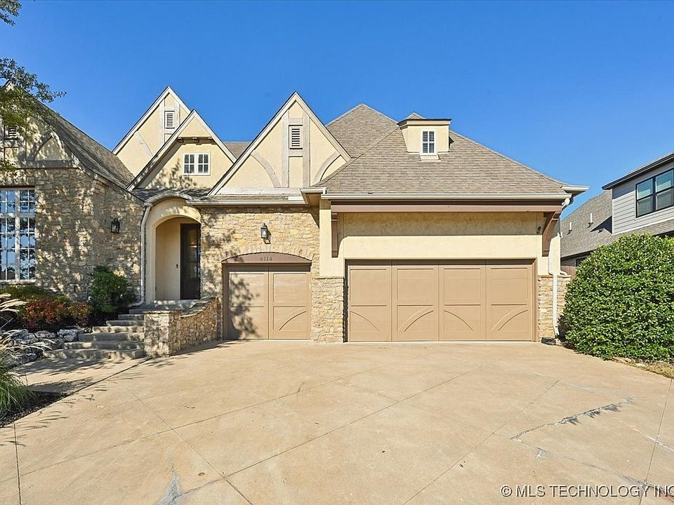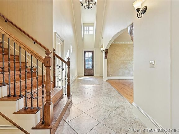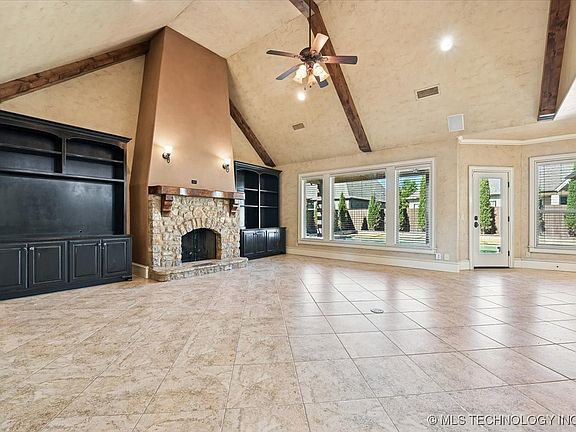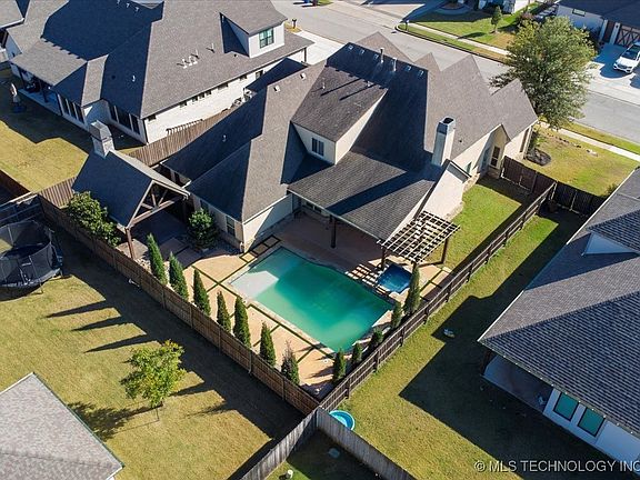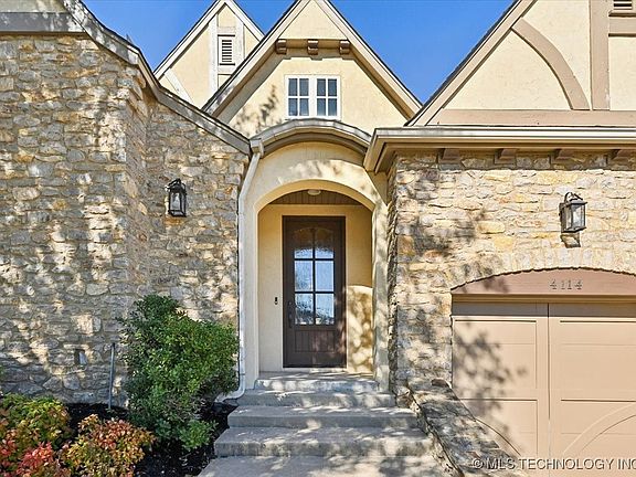 Fabulous French styled stucco and stone home in desirable Southern Trails! This home boasts an outdoor oasis with refreshing pool, relaxing hot tub, two covered patios, one with added fireplace for cozy evenings. Grand two story entry opens to great room with stone fireplace, wood beam ceiling accents, built in shelves, wet & dry bar and open kitchen with granite island, double ovens and cooktop. Executive vaulted office and formal dining room. First floor primary ensuite with oversized spa like bath and large walk in closet. Second bedroom downstairs with private bath. Second floor offers large game room with separate home theatre, ideal for entertaining. Two additional bedrooms with pullman bath. Each have large walk in closets. Three car garage with lots of storage and built in cabinets. Easy access to Creek Turnpike and close to Cedar Ridge Country Club.