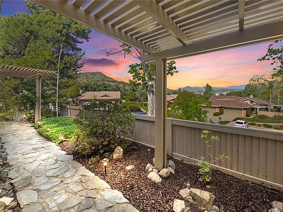 Tucked away on a quiet cul-de-sac with breathtaking mountain views, this single-level gem in the coveted Pala Mesa Fairway Villas community is the lifestyle you’ve been looking for. With 2 bedrooms, 2 bathrooms, and a 2-car garage, it’s the perfect blend of comfort, charm, and convenience. Step through a private gated courtyard and into a light-filled interior where fresh white paint and rich laminate floors set a warm, welcoming tone. Just off the entry, a versatile den with built-in shelving and stunning mountain views makes the perfect space for a home office, cozy library, or bonus hangout spot.