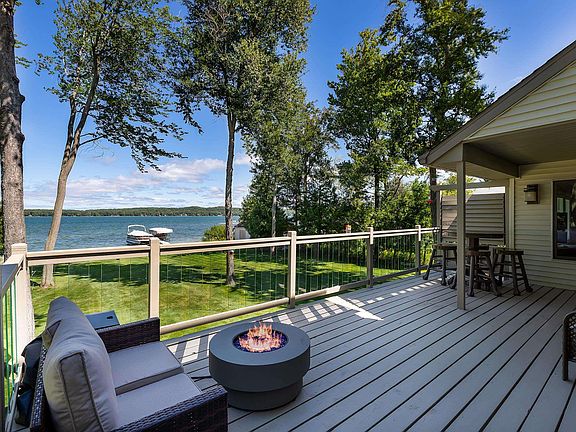 Perfectly positioned on Birch Point, this stunning year-round, turnkey 5-bedroom home offers 100 feet of private frontage on one of Northern Michigan’s most desirable all-sports lakes. With direct connection to the Platte River and Lake Michigan, endless adventures—boating, kayaking, or fishing—begin right outside your door. Inside, the open-concept floor plan captures panoramic lake views from nearly every angle. A chef's dream kitchen with granite countertops, custom cabinetry and island perfect for entertaining. The main floor primary suite is a true retreat, complete with a walk-in closet and a beautifully remodeled bath featuring a soaking tub, tiled shower and tile floors. Two additional bedrooms and a full guest bath provide comfort in the main portion of the home. A private guest apartment—complete with full kitchen, family room, two bedrooms, and a full bath ensures your visitors feel right at home. Step outside to the expansive deck and enjoy sweeping views over the manicured lawn and sparkling water. A serene waterscape feature adds to the tranquil setting, creating the perfect backdrop for entertaining or quiet relaxation. Storage and convenience abound with an attached heated garage, a detached three-car garage with heated workshop, a lower lakeside garage, and two storage sheds ideal for all your seasonal and water toys. The property has been thoughtfully updated and meticulously maintained, offering peace of mind for years to come. Located just minutes from Honor, Frankfort, and Beulah, you’ll also enjoy easy access to Sleeping Bear Dunes National Lakeshore, the Platte River Campground, and the iconic scenic drive along M-22. Whether you’re seeking outdoor recreation, charming small towns, or simply lakefront serenity, this home offers the very best of the Up North lifestyle.