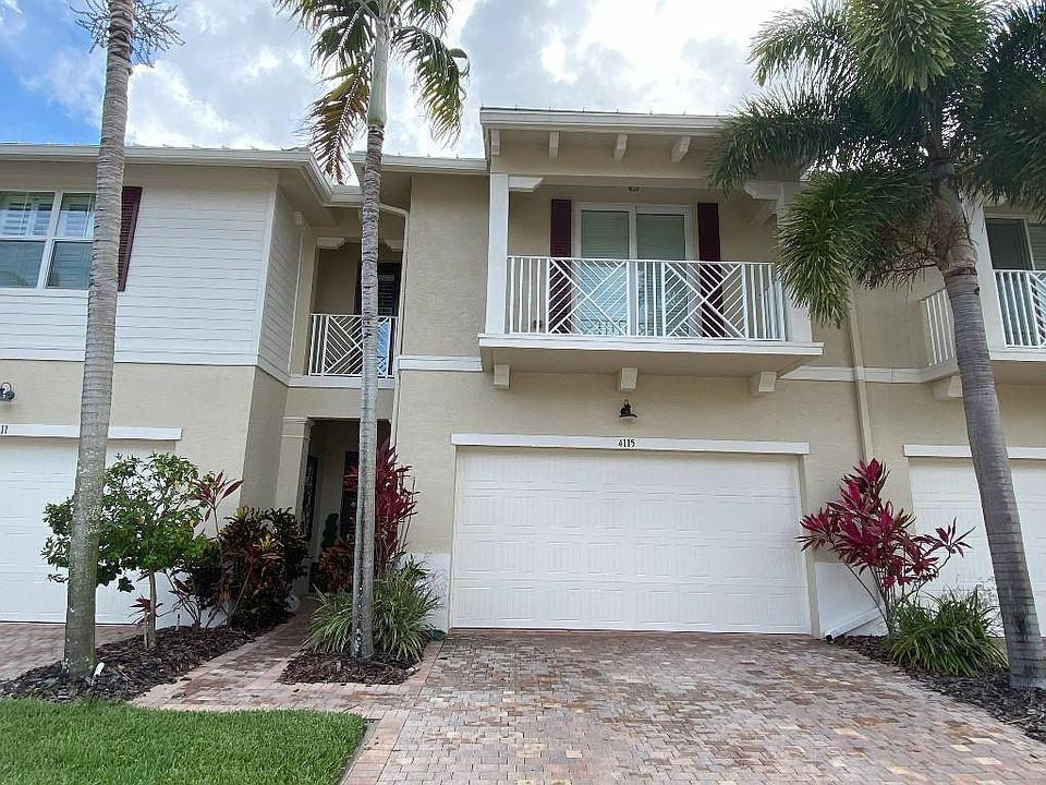 Beautiful, cared for Hampton Cay Townhome in great gated location close to turnpike, I-95, shopping and dining. 3 large bedrooms and 2 1/2 baths, impact glass windows, doors, and metal roof. Screened porch on lower level and all 3 bedrooms have a private balcony. Primary bedroom with two walk-in closets and private bath with two separate vanities, shower, and separate tub. Newer Bosch appliances in Kitchen with granite countertops, pantry and large storage area under stairs. Crown moldings and plantation shutters throughout. Living room with built in entertainment center. Tile downstairs and wood laminate floors upstairs. Epoxy finished garage floors, and built in storage cabinets. Community has clubhouse, fitness center, heated pool and spa, 3 lakes, sidewalks. Furniture Negotiable