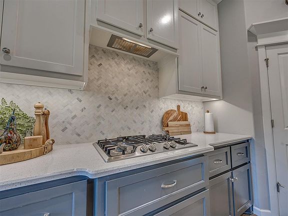 Attractive & well kept 4 bed 2 bath home in Delmer Lakes backing to green space! Located just 3 homes from the neighborhood playground and walking trails that access both ponds making it an ideal location within the neighborhood. Storm shelter, tankless water heater, full guttering & outdoor fireplace are a few of the stand out features in the home. Wood look tile flooring flows seamlessly through main areas of the home including living, hallways, kitchen and dining creating an attractive flow. The living room offers multiple layout options with a dry stack stone gas fireplace and 3 large picture windows providing a picturesque view of the backyard and green space behind. The kitchen features an impressive 8' quartz island, quartz countertops, cabinets to the ceiling, built-in stainless steel appliances and a large single basin stainless steel sink. Corner pantry is spacious & efficient.