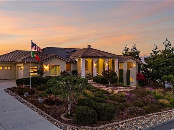 Enjoy city light views from a spacious deck and patio with solar-heated pool, spa, vineyard, fruit trees, shed, 3-car garage, and additional standing room subarea storage. HOA includes a community clubhouse and park.