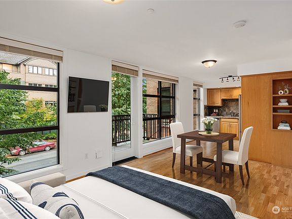 Experience modern living in this spacious studio at the Dakota building in West Seattle. This updated unit features hardwood floors, a gourmet kitchen with maple cabinets, granite counters, natural stone backsplash, and stainless steel appliances. Freshly repainted interiors and large windows create a bright, welcoming atmosphere. The unit offers a large walk-in closet, full-size washer & dryer, a private terrace, and a premier parking spot in the secure garage next to the lobby entrance. The building boasts an elevator, a rooftop deck with stunning views, and a well-managed HOA with strong reserves. With a 96 Walk Score, you're steps from beaches, dining, shopping, and more.