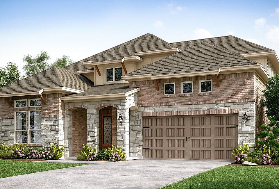 The largest plan in the Cambridge Collection, the grand two-story Brampton floor plan design by Village Builders features a welcoming front porch and entry foyer, 1st floor guest suite, a dining room with an adjoining butler's pantry that offers access to a large walk-in kitchen pantry, a breakfast room that offers access to a covered rear patio, an open island kitchen, and a generous family room. The first floor master bedroom features an en suite master bathroom with dual sinks, a separate corner tub and shower with built-in seating, and a spacious walk-in master closet that offers access to a handy utility room with freezer space. The second floor features a game room, two secondary bedrooms, a full bathroom, and a dedicated media room. Outdoor oasis includes pool/spa with water features and fire bowls along with large covered patio with travertine decking, ceiling fan, lighting, and gas line.