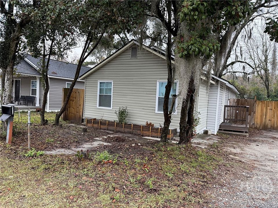 The property is a single-story house with a simple and practical design. The exterior is clad in light beige vinyl siding, giving it a clean, low-maintenance look. It has two front windows that allow for good natural light in the main living areas.