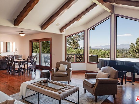 Set on a quiet cul-de-sac, this four bedroom, three and a half bath Studio City estate feels like a Lake Tahoe escape while offering LA convenience. Surrounded by sweeping unobstructed views and lush greenery, the home is designed for seamless indoor outdoor living with floor to ceiling glass doors opening to expansive wraparound decks. Inside, warmth and character abound with four fireplaces, a sprawling wine cellar, and a spa inspired primary suite featuring a rock pebble steam shower and soaking tub. The chef's kitchen is a true centerpiece, outfitted with Viking Professional appliances, handcrafted cabinetry, hammered copper sinks, dual pantries, two dishwashers, and a hand hewn granite island with a distinctive roped edge. The grounds feel like a private mountain retreat with a footbridge spanning a cascading waterfall and tranquil patios tucked into the landscape, while a lower level unfinished space offers flexibility for a future guest suite or ADU. Just minutes from major studios, Harvard Westlake, the Westside, and Ventura Boulevard's premier shopping and dining, this rare hideaway offers the perfect blend of Tahoe style serenity and Los Angeles lifestyle.