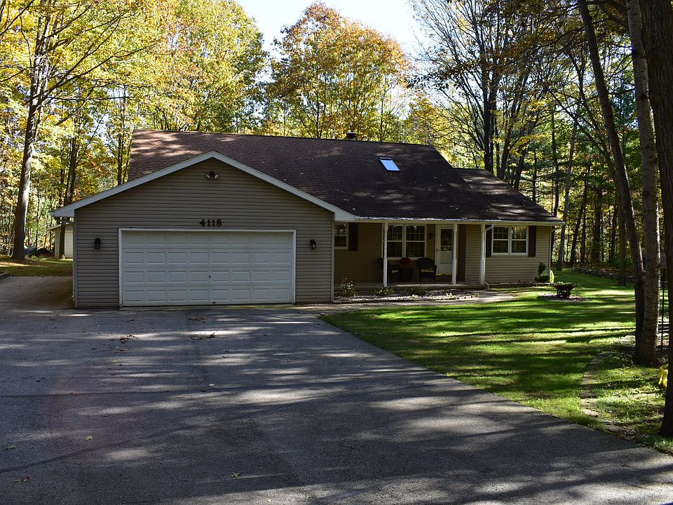 Well maintained home on a quiet, wooded lot! 3 bedroom, 2.5 bath ranch style house with an attached 2 car garage. Wood burning, brick fireplace and vaulted wood ceiling in living room, equipped with large 3 door patio door to take in the beautiful wooded backyard. Split bedroom design. Large master bedroom with double closets and shelving with attached master bathroom. Kitchen has new appliances and countertops, as well as a full pantry, tile floor, and skylight over dining area. House features a newly finished basement equipped with a large bar area, living area, closed off storage area with shelving, half bath, laundry area, and bonus room. House features a laundry shoot into basement. Egress windows in basement for great natural light! Lots of updates! New carpet- 2018 Finished basement- 2017 New water heater- 2017 Water softener- 2016 New appliances- 2016 New kitchen countertops- 2015 Gutter guards- 2015 New landscaping and rock- 2014 New outlets and switches- 2014 New light fixtures- 2014 House sits on almost an acre of wooded land. Private backyard with no homes behind. Backyard features a nice sized deck, brick and stone fire pit, raised garden beds, large shed with electricity, gravel driveway along side of shed great for parking a trailer. Lots of perennials planted and landscaped retaining wall. House features a private well and septic system. Negotiable for sale with home: Basement barstools Washer and dryer