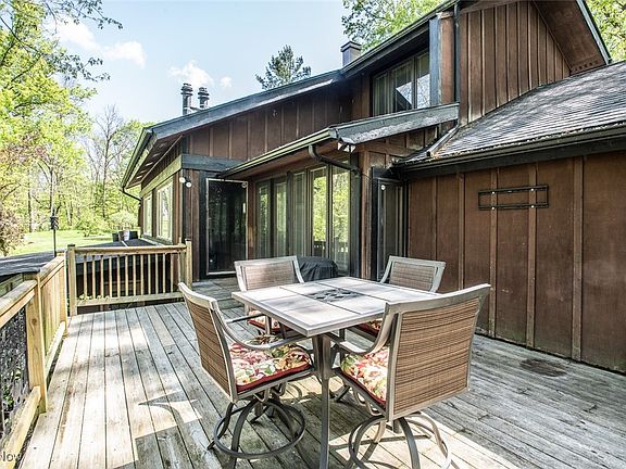 Step inside this unique three-story home to find a dramatic two-story stone fireplace that sets the tone for a cozy, rustic ambiance. A wall of windows fills the open-concept main floor with natural light and picturesque green views. The spacious kitchen features abundant cabinetry, a large center island, built-in command center, and an oversized dining area—perfect for hosting. The first floor also offers a bedroom and an updated full bath. Upstairs, you'll find two generously sized bedrooms with vaulted ceilings, new flooring (2024), and ample closet space. The beautifully updated second-floor bath features a walk-in tile shower. The walk-out basement offers endless possibilities—from game nights to wine tastings and summer barbecues, this space is ready to be transformed into your favorite hangout. Celebrate cool evenings by the woodburning stove. Step outside to enjoy the two-story deck or unwind in the gazebo—wired for electricity and ideal for a hot tub or evening cocktails. Recent updates include: Roof (approx. 8 years ago)*Central air (approx. 12 years ago)*New second-floor flooring (2024)*Vinyl plank flooring on the main level*Two updated bathrooms*