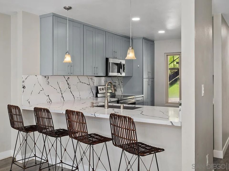 Discover this beautiful first-floor 3-bedroom, 2-bathroom condo in the gated Village Square community of Clairemont, featuring a spacious living room, a modern kitchen with high-end cabinetry, quartz countertops, stainless steel appliances, and upgraded lighting, along with stylish bathrooms, fresh paint, updated hardware, and ceiling fans. Enjoy a tranquil park-like setting with an oversized private patio offering a serene pool view, all within walking distance to shops, restaurants, and grocery stores, with easy freeway access. HOA dues include water and trash, making this turnkey home a low-maintenance retreat in one of San Diego’s most desirable neighborhoods.