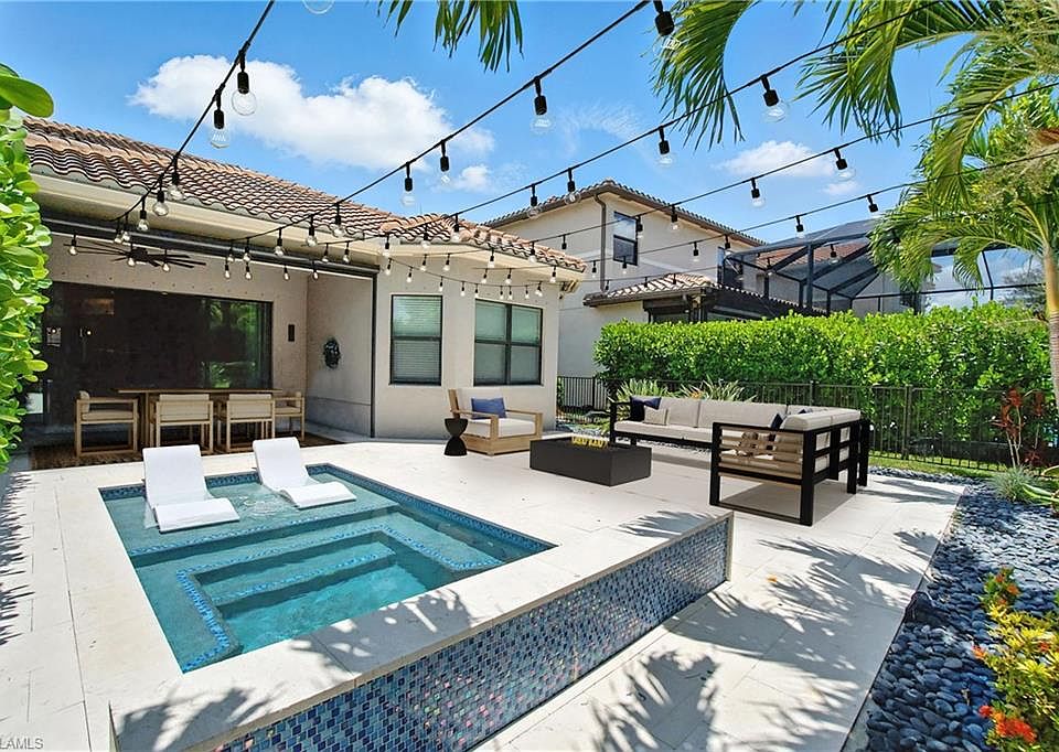 This stunning, move-in ready home offers the perfect blend of style, function, and comfort. Located on a quiet cul-de-sac, the home features a pool and spa with sunshelf, a spacious travertine lanai, and a fenced backyard with green space—ideal for relaxing, entertaining, or enjoying time with pets and family. Inside, the open-concept floor plan offers luxury vinyl plank flooring on the main level, a chef’s kitchen with granite countertops, Café series gas stove and double oven, upgraded backsplash, and a reverse osmosis system. The first-floor primary suite includes two custom walk-in closets and a spa-like bath with a rain head shower. Upstairs, a loft-style living area and three additional bedrooms (including one en suite) provide plenty of space for family, guests, or a home office. This home offers both privacy and convenience—just a short walk to the community center and close to the gate for easy access. With thoughtful upgrades, a flexible floor plan, and a backyard retreat, this is one you won’t want to miss. Schedule your private showing today! Stonecreek is one of North Naples’ most desirable guard-gated communities, just minutes from world-class beaches, top-rated schools, and favorites like Seed to Table. Residents enjoy resort-style amenities including a clubhouse with indoor sports court, fully equipped gym, beach volleyball, tennis, pickleball, lap and resort-style pools, a splash pad, shaded playground, and events for all ages. Some photos include reality renovation/reality staging. *THIS PROPERTY INCLUDES DESIGN SERVICES, MAKING FURNISHING, AS SHOWN, EASY FOR YOUR BUYER*