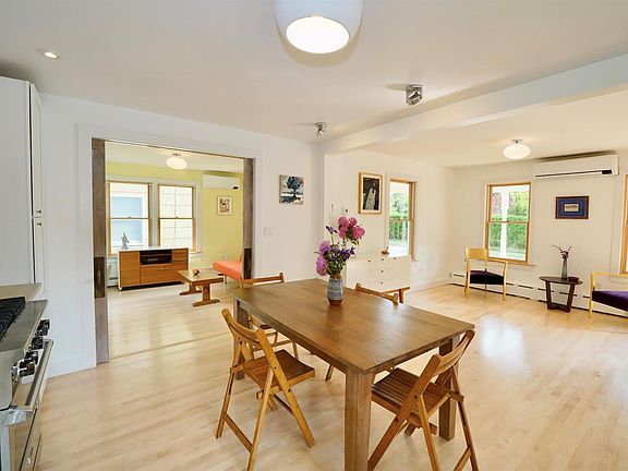 This restored home has been thoughtfully rebuilt, showcasing its original pine flooring and classic front porch. The inviting lower level boasts an open-concept kitchen and living area, complemented by a sun-drenched room with water views, separated by pocket doors—ideal for a formal dining room or a versatile third bedroom. A full bath on this level adds convenience.